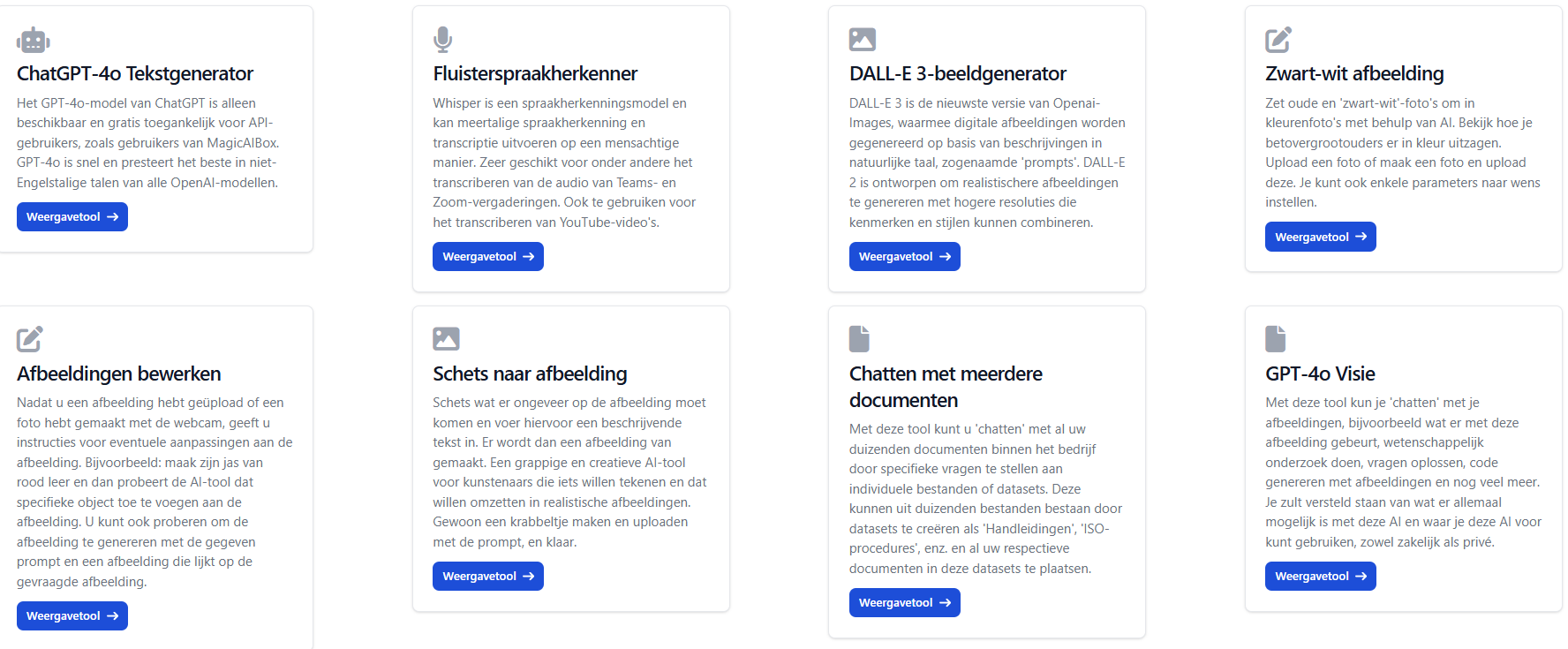 Met een eigen AI-omgeving kunt u de toegang voor medewerkers of afdelingen eenvoudig beheren en gebruikmaken van krachtige AI-modellen en tools. Denk aan modellen van OpenAI, zoals ChatGPT-4, GPT-4 Vision, DALL-E en Whisper, aangevuld met relevante plugins. Hiermee kunt u altijd werken met actuele datasets, bijvoorbeeld van nieuwssites of reissites.